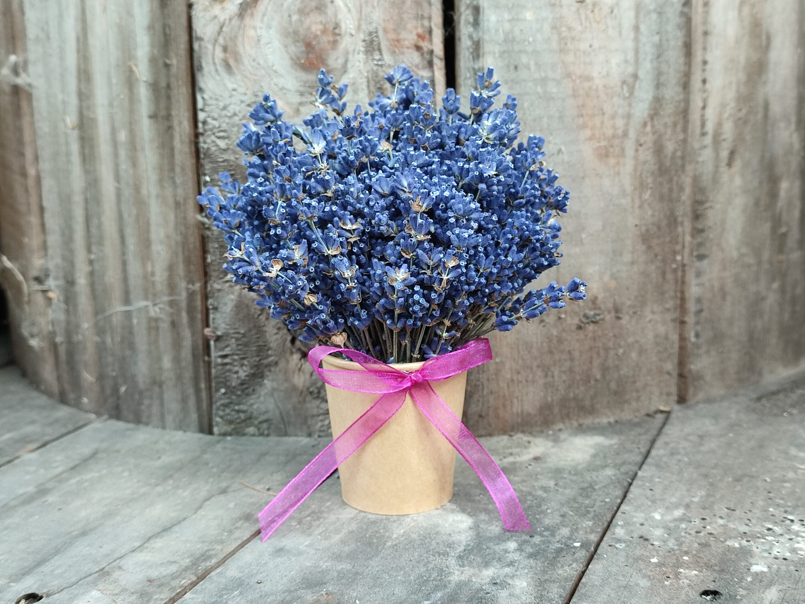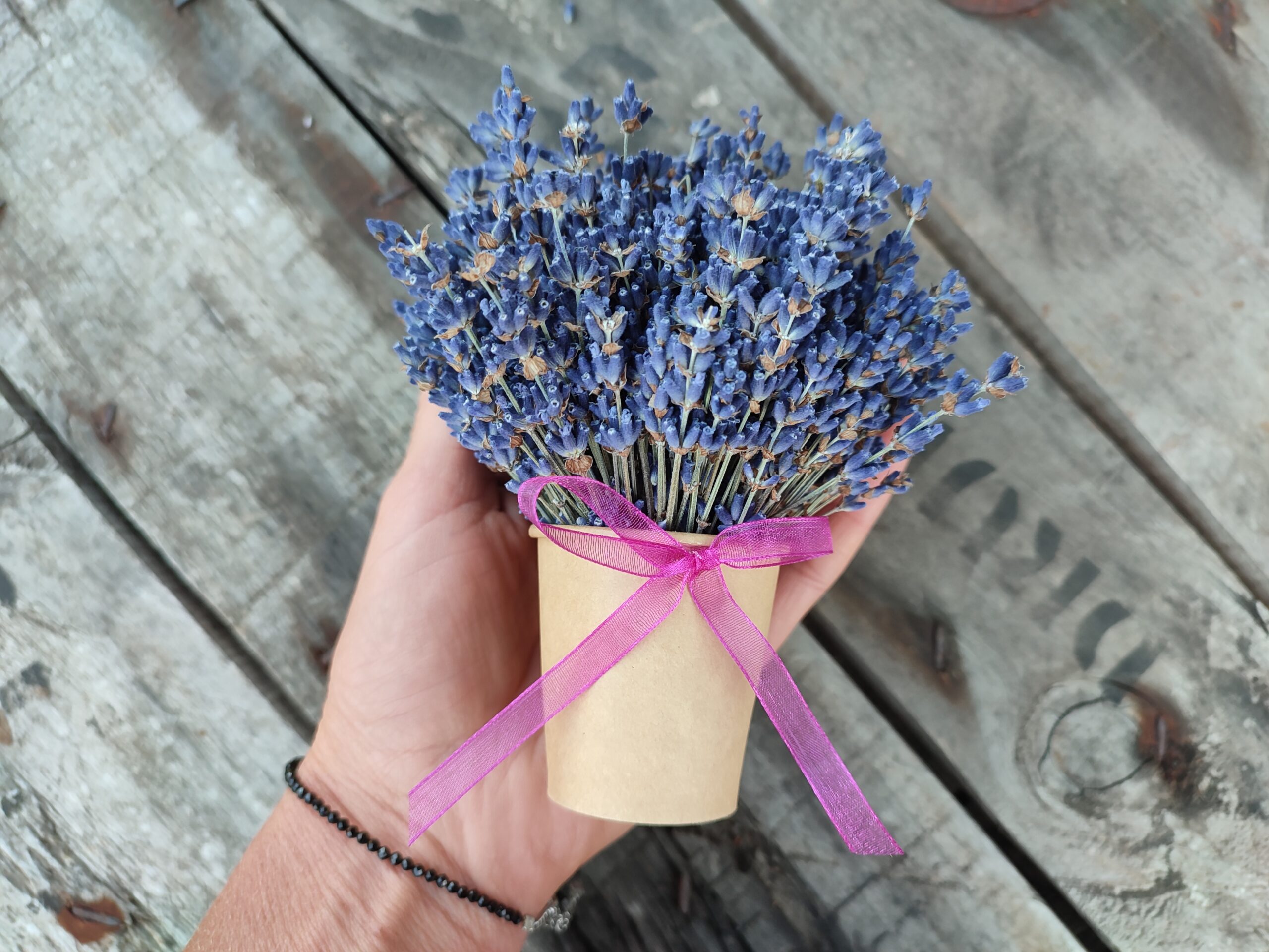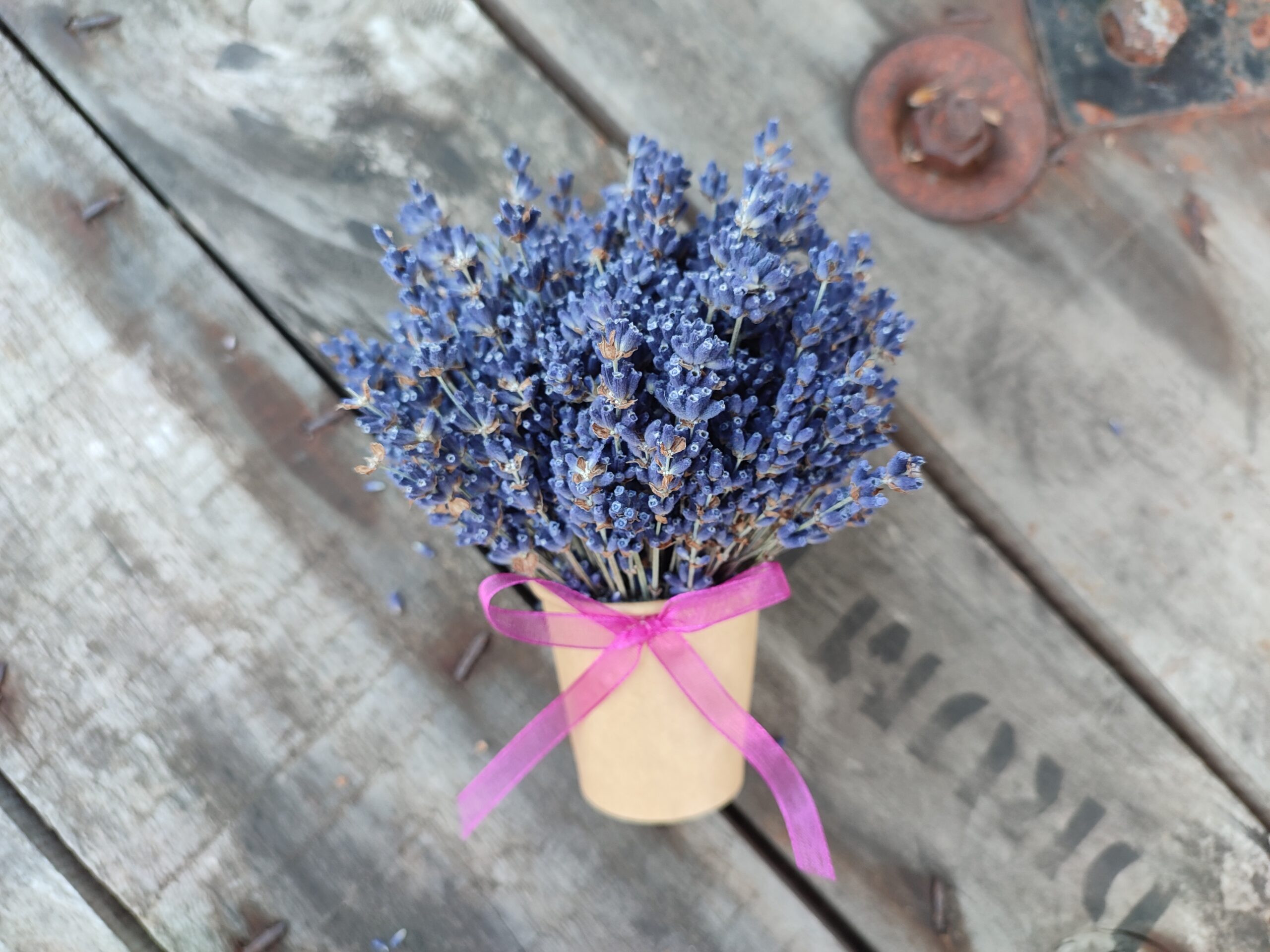 Piękny, naturalny, bukiet lawendy w tekturowym kartoniku z kokardą